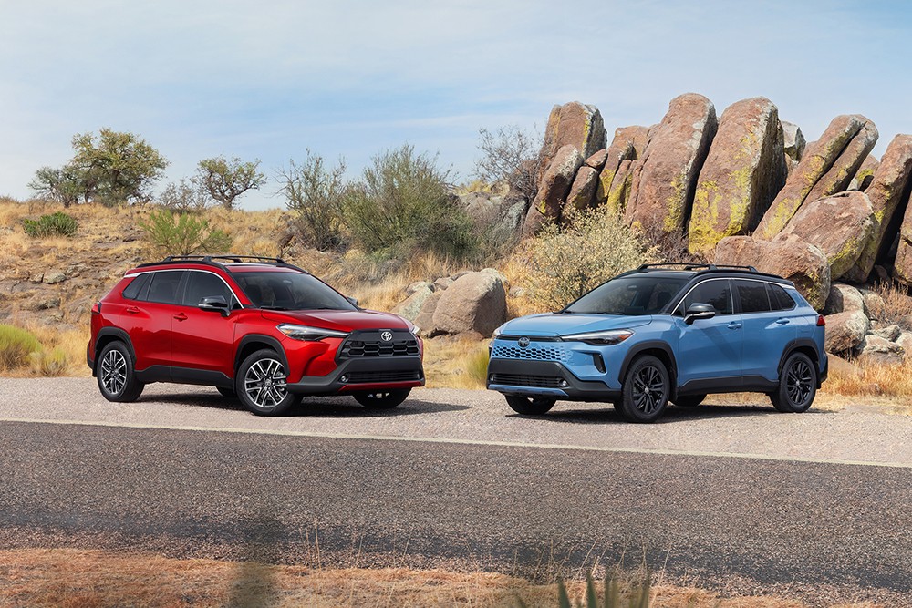 The 2026 Corolla Cross presents two updated front-end designs, featuring a color-matched grille on hybrid models and a traditional grille for gas models.